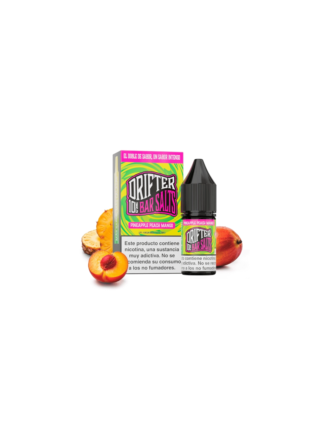 Juice Sauz Drifter Bar Pineapple Peach Mango. Combina los sabores de piña jugosa, melocotón dulce y mango maduro, creando un vapeo delicioso y refrescante. Ofrece una experiencia de vapeo tropical, dulce y afrutada.