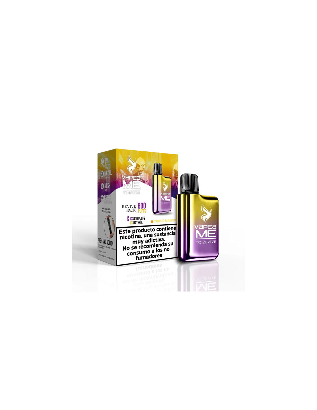 Este paquete To Revive incluye un vaper recargable con un diseño ergonómico, resistente y fácil de transportar, en un elegante degradado de dorado a morado con efecto metalizado. También contiene una cápsula con 800 inhalaciones de sabor a triple mango intenso y 20mg de nicotina.