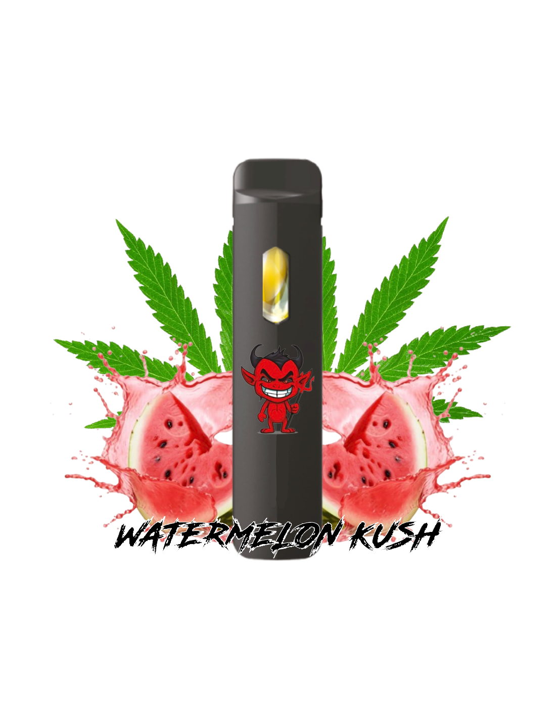 El Vaper Demoniete Canallita desechable de Watermelon Kush, con un 90% de 10-OH presenta un sabor muy característico con toques cítricos y unas notas fuertes afrutadas, recogidas de unos cogollos verdosos claros e intensos con abundante resina y pistilos de color dorado.